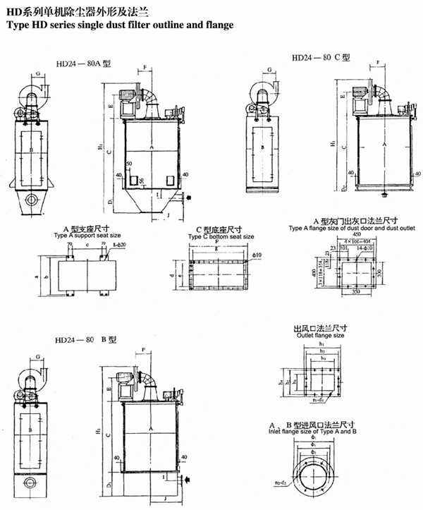 HD型袋式除塵器有六種規(guī)格:分A、B、C三型,A型設(shè)灰門、B型設(shè)抽屜,C型既不設(shè)灰門也不帶抽屜,下部加法蘭根據(jù)用戶要求直接配接在庫頂、料倉、皮帶運(yùn)辦機(jī)等揚(yáng)塵設(shè)備上就地除塵,粉塵直接回收。