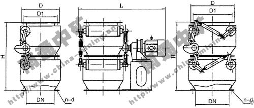 DN | D1 | D | H | H1 | L | n-d | 卸灰能力m3/h | 傳動裝置型號 | 開閉頻率次/min | 功率kw |