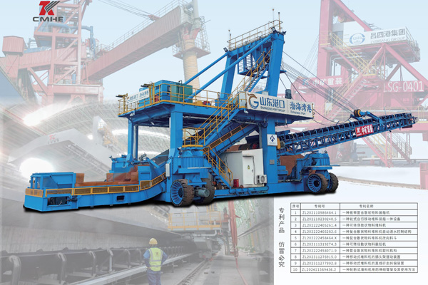 移動式堆料裝船一體機,輸送物料>1000t/h,對不同 輸送物料具有更好的適應性,是一種大型、連續、高效的散料機械。行走采用實心輪胎、液壓升降、旋轉取代固定式軌道,增加堆場利用率,作業靈活,可任意轉場,整機移動不存在局限性,輸送機構采用板條和皮帶復合結構,提高了裝載和輸送散料的適應性和承受力,提高了輸送機的裝載效率和能力;設計了智能化防過載系統,保證了大噸位、大輸送時設備的安全性,進料、輸送集為一體,二者均安裝于一個公共底盤之上,構成一體式移動設備;同時臂架具備俯仰、回轉功能方便靈活堆料、裝船。設備可選用柴油發電機組、電纜卷筒、電池供電,整個系統具有完整地獨立性。移動式堆料裝船一體機適用于堆粒度0~100 mm的沙、礦石等,物料 堆密度:0.35~3.0 t/m3,是大中小型火力發電廠、碼頭、礦山、冶金、化工和造紙廠等工礦企業的儲料專用的優良設備。